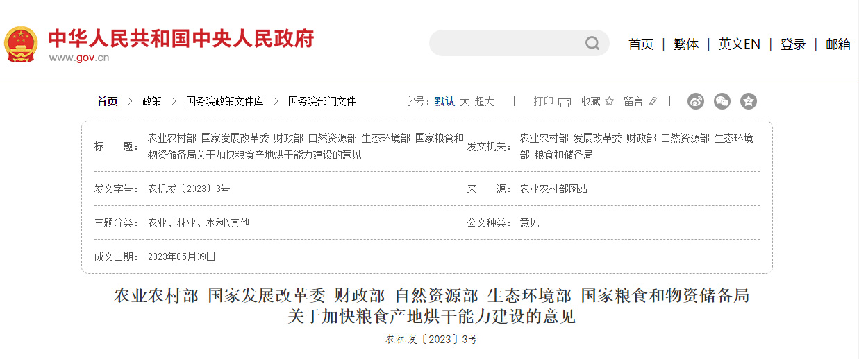 國家五部委發(fā)布關(guān)于加強糧食產(chǎn)地烘干能力建設(shè)的意見