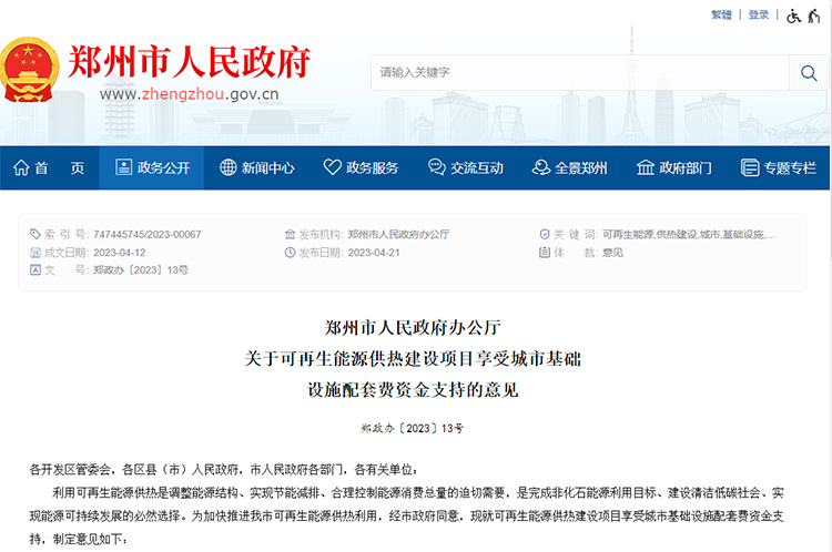 提升可再生能源供熱利用 鄭州將對(duì)相關(guān)建設(shè)項(xiàng)目提供配套資金支持