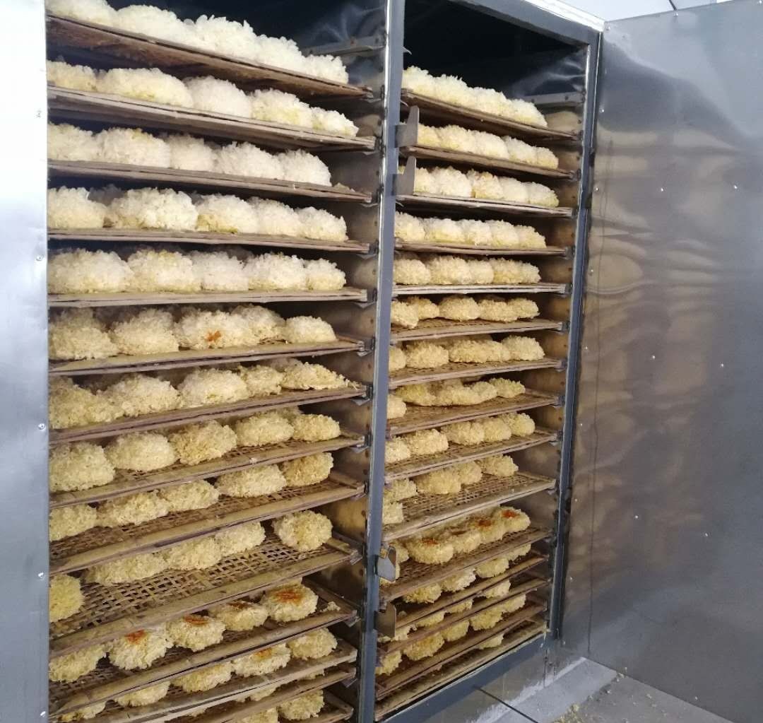 益源食用菌有限公司作為古田縣優秀企業之一,旗下主要產品銀耳干燥加工技術采用正旭熱泵烘干機組,銀耳烘干加工流程一般分為清水浸泡—挑選—瀝水—烘干—包裝。采摘下來的銀耳先用清水浸泡,銀耳會發漲飽滿,再挑選出有黑點或腐爛的次品。平均分層裝架,自然瀝水一個小時再推進烘干房烘干。烤箱溫度控制在60-80度,熱風由風機直接吹送到物料表面,確保每層銀耳均勻的通風受熱。前四個小時濕度非常大,排出的高濕高溫空氣不進行循環,及時的排濕能保證銀耳不變質不變色。后四個小時烤箱溫度控制在70度以上,烘干到銀耳可捏碎。由于銀耳吸水型比較好,烘干的銀耳要使用包裝袋打包,放于除濕房或冷庫存放。