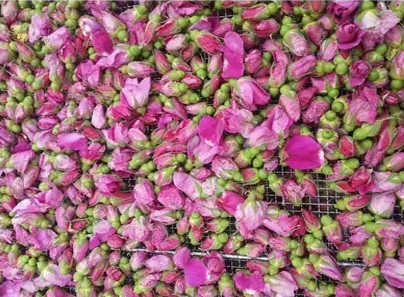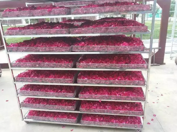 如果是烘干玫瑰花瓣,在玫瑰花盛開之后采摘即可。如果烘干的是玫瑰花蕾,需在花蕾剛剛散而未開的時候采收最好,采的太遲的話,恐防花蕾在烘干過程中花瓣散落。烘干的玫瑰花花蕾選用12小時內采摘的新鮮花蕾為佳,色澤鮮艷,花朵大小均勻,弱小花蕾少于5%;蕾托完整,無花柄,無雜質,無蟲蝕,無人為灑水,使水現象;無異味,香味純正;無半開花蕾,無開放花朵。分批次采摘的玫瑰花,不能一下就送入烘干房,烘干之前大量花蕾應進行攤晾以防發熱,然后準備好分批次、裝盤上車、入房。