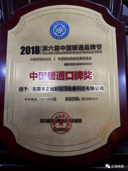值得一提的是,本屆暖通品牌節(jié)頒獎典禮上,結合數(shù)據(jù)統(tǒng)計、調研分析、問卷調查、電話訪談等多種形式,并憑借自身產品質量好,售后服務佳等良好的口碑,正旭空氣能不負眾望,繼2016年獲得中國暖通品牌“創(chuàng)新產品獎”后,再度榮獲“2018年中國暖通口碑獎”。