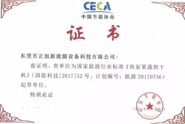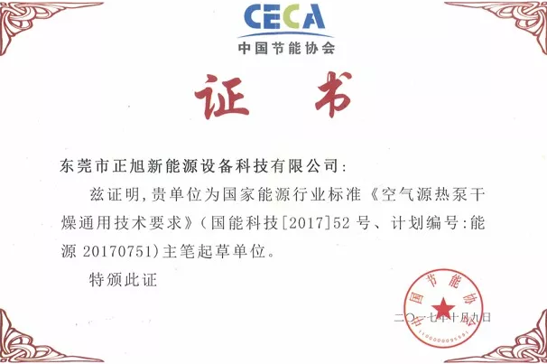 其中,正旭新能源為《空氣源熱泵糧食干燥機》、《空氣源熱泵煙葉干燥機》、《空氣源熱泵烤煙烤房技術規程》三項標準起草單位。此外,正旭是國家能源行業標準《空氣源熱泵干燥通用技術要求》主筆起草單位,《熱泵果蔬烘干機》、《戶用及類似用途空氣源熱泵采暖機組》等標準起草單位。