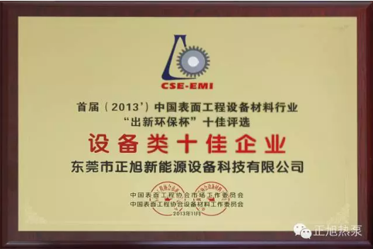 值得一提的是,2013年由中國表面工程協會主辦的首屆(2013’)中國表面工程設備材料行業“出新環保杯”十佳評選表彰大會上。經過十佳評選專家組十三名專家的嚴格評選和一致認定,正旭電鍍專用熱泵為電鍍行業用戶取得了良好經濟效益和節能減排效果,被授予《設備類十佳企業》稱號,成為首個被電鍍行業認可而獲頒此項殊榮的熱泵品牌。