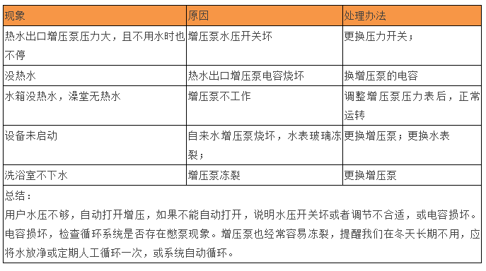 排除:更換水箱,冷水進(jìn)壓力不足,熱水出禁用增壓泵,改進(jìn):冷水進(jìn)使用增壓泵功率必須是相符的不能過大;冷水進(jìn)必須安裝單向止回閥。