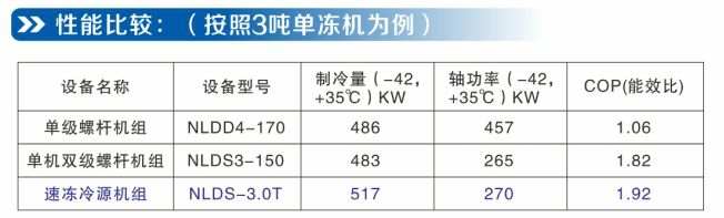 1、節能效果明顯。速凍冷源機組高低壓縮比1:3左右,這種配組節能效果明顯優于傳統的(高低壓縮比1:2)單機雙級螺桿壓縮機。比單級壓縮節能50%左右。