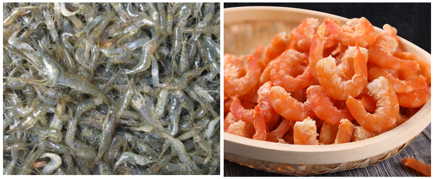 3、按以上的干燥步驟,用蝦米熱泵烘干機烘出的蝦干體形完整、外觀整潔,色澤自然,呈淡黃淡紅而有光澤,肉質豐滿,蝦身彎曲,帶獨特的自然鮮香。