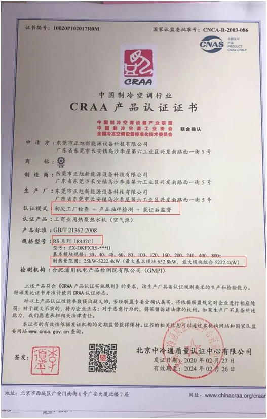 實至名歸 | 正旭研發新型大功率空氣能熱泵獲得CRAA性能認證