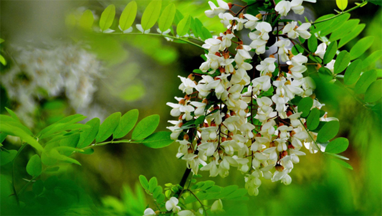 “裊裊秋風(fēng)多,槐花半成實(shí)”?;被?,又名洋槐花,在中國各地廣為栽培,尤以我國黃土高原、華北平原一帶為主?;被ǎㄑ蠡保槎嗌?,總狀花序,蝶形花冠,盛開時(shí)成簇狀,重疊懸垂,小花多皺縮而卷曲,花瓣多散落,完整者花萼鐘狀?;被ㄔ诿磕甑?、5月份開花,花期一般為10-15天。每逢花期,串串潔白花苞綴滿枝頭,清風(fēng)拂過,空氣中彌漫陣陣素雅芳香,沁人心脾。在農(nóng)村,槐花既可制作槐花荊芥飲、槐菊茶、大黃槐花蜜飲等茶飲,亦可作餡包成槐花包子、槐花餃子、槐花煎餅等。