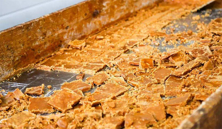 傳統的加工紅糖一般會經過榨汁、開泡、趕水、出糖、打沙、成型等基本步驟,然后經過傳統柴火灶旺火熬制6小時,不斷攪拌讓水份慢慢的蒸發掉,趕水、打沙等18道工序熬制。