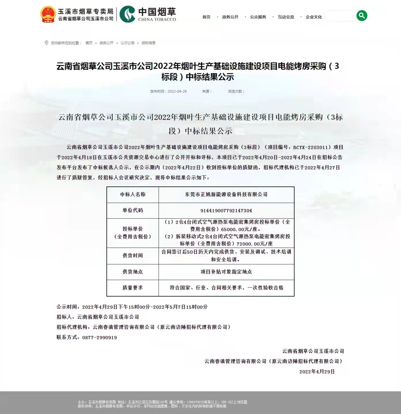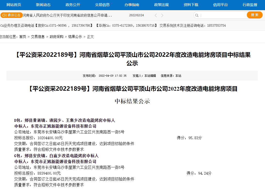 此前,正旭成功從眾多競爭對手中脫穎而出,成功中標河南省煙草公司平頂山公司2022年度改造電能烤房項目,正旭為此次項目提供改造電能烤房492座,中標金額高達19043800元。此次項目的中標,不僅擴大了正旭在河南地區的影響力,也為正旭在煤改清潔能源項目上增添了濃墨重彩的一筆。