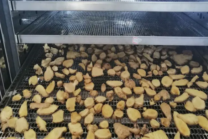 2. 處理好后把姜片均勻擺在托盤上,不要過度重疊,否則水汽蒸發(fā)不暢,影響烘干效率;