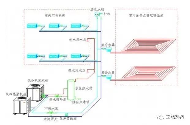首先我們要了解什么是空氣源熱泵采暖。空氣源熱泵采暖是指空氣源熱泵+采暖末端(地暖、暖氣片等)+水管、閥門等輔件組成的一套取暖系統(tǒng)。這套取暖系統(tǒng)的核心是空氣源熱泵主機,空氣源熱泵工作時利用少量電能驅(qū)動熱泵運行,吸收空氣中的低溫熱量并增溫壓縮成高溫熱能,再通過換熱器將高溫熱能交換到冷水中,將冷水升溫,之后利用水管,將熱水輸送到室內(nèi),通過采暖末端為室內(nèi)提供溫度和熱水。