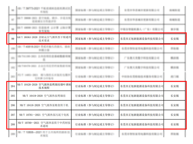 12月5日,東莞市市場監督管理局官網發布了《關于2022年東莞市促進高質量發展專項資金標準化戰略擬資助項目的通告》,擬對本市符合資助條件的項目進行資助。其中,東莞市正旭新能源設備科技有限公司憑借參與制定《金銀花空氣源熱泵干燥通過技術要求》國家標準及《空氣源熱泵烤煙房煙葉調制技術規程》、《空氣源熱泵烤煙房》、《空氣源熱泵糧食烘干機》、《空氣源熱泵污泥干化機》、《空氣源熱泵烘干中藥材技術通則》五項行業標準成功入圍。正旭空氣能積極響應國家號召,深入貫徹廣東省政府“關于加快推進質量強省建設的實施方案”精神,以科技創新驅動新能源行業高質量發展,在熱泵行業彰顯正旭擔當,貢獻正旭力量。