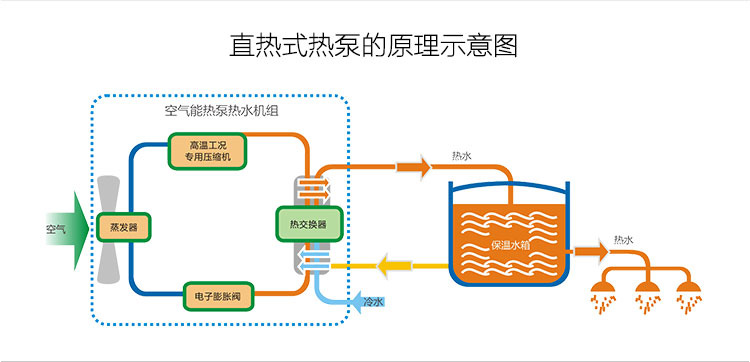 在工程設(shè)計上,循環(huán)式熱泵在工程設(shè)計中有兩種循環(huán)加熱方式,一種是熱泵機(jī)組直接和熱水箱相連,直接循環(huán)加熱,好處是工程簡單、造價低,缺點(diǎn)是循環(huán)加熱過程中不能使用熱水(水溫未達(dá)到,系統(tǒng)自動停止供水),比較適合定時供應(yīng)熱水的場景。