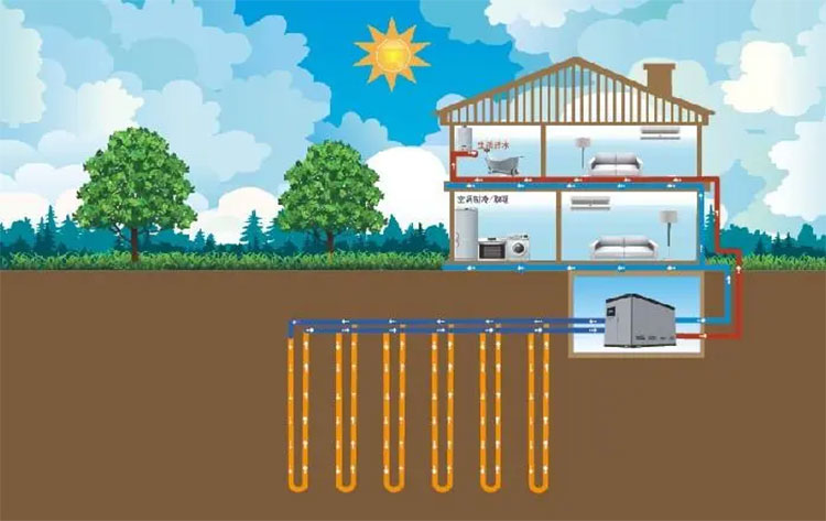 地源熱泵是一種利用淺層地熱資源實現制熱及制冷的高效節能設備。地源熱泵同樣是通過輸入少量電能,將土壤中的低溫熱能向高溫位熱能轉移,實現冬季供熱和夏季制冷的需求。即在冬季,把土壤中的熱量取出來,提高溫度后,供給室內采暖;在夏季,把室內的熱量取出來,釋放到地能中去。與空氣源熱泵一樣,地源熱泵的最大優點也是節能效果顯著,產生同樣的制冷取暖效果時,地源熱泵比一般中央空調省電30%-40%。且無室外排熱、冷暖兼用、無室外機,不影響建筑外觀。