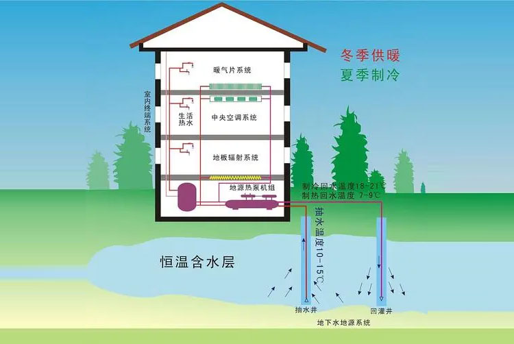 水源熱泵是將地下水、河流和湖泊中吸收的太陽能和地熱能而形成的低品位熱能資源,通過少量的高位電能輸入,實現低位熱能向高位熱能轉移的一種技術。其同樣可一機多用、同時實現制熱與熱冷,且運行效率高、運行成本低。