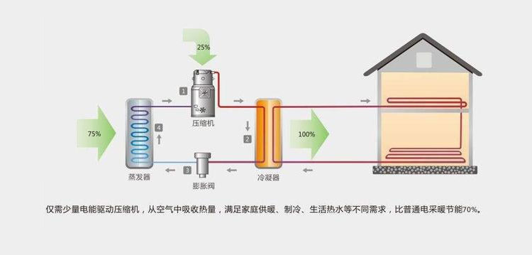 空氣源熱泵是一種利用少量電能驅動壓縮機做功、通過冷媒的物理相變并結合冷凝器及蒸發器進行熱交換、從而將空氣中的熱能轉移到其它地方的裝置。它的優點是節能效果顯著,一度電能當三度電用,相對比傳統電熱裝置節能75%以上,且應用范圍廣泛,在-25℃至40℃環境中均能正常使用,不受陰、雨、雪等惡劣天氣和冬季夜晚的影響,運行過程中不產生任何污染物排放,是一款真正既節能又環保的設備。