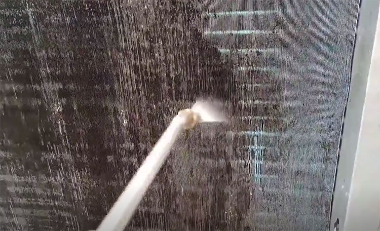 接下來,對于熱泵蒸發器翅片上較重的塵垢污物,可使用細軟毛刷或者用電動吸塵器清除一遍,吸塵器可有效清除翅片上粘染并難以清洗絮狀物、灰塵等,然后再用高壓水槍進一步沖洗翅片表面灰塵。之后再用噴頭式清潔劑,順著翅片的方向從上往下清洗,從左到右來回均勻噴射至蒸發器的翅片上,保證清潔泡沫完全將蒸發器表面覆蓋。