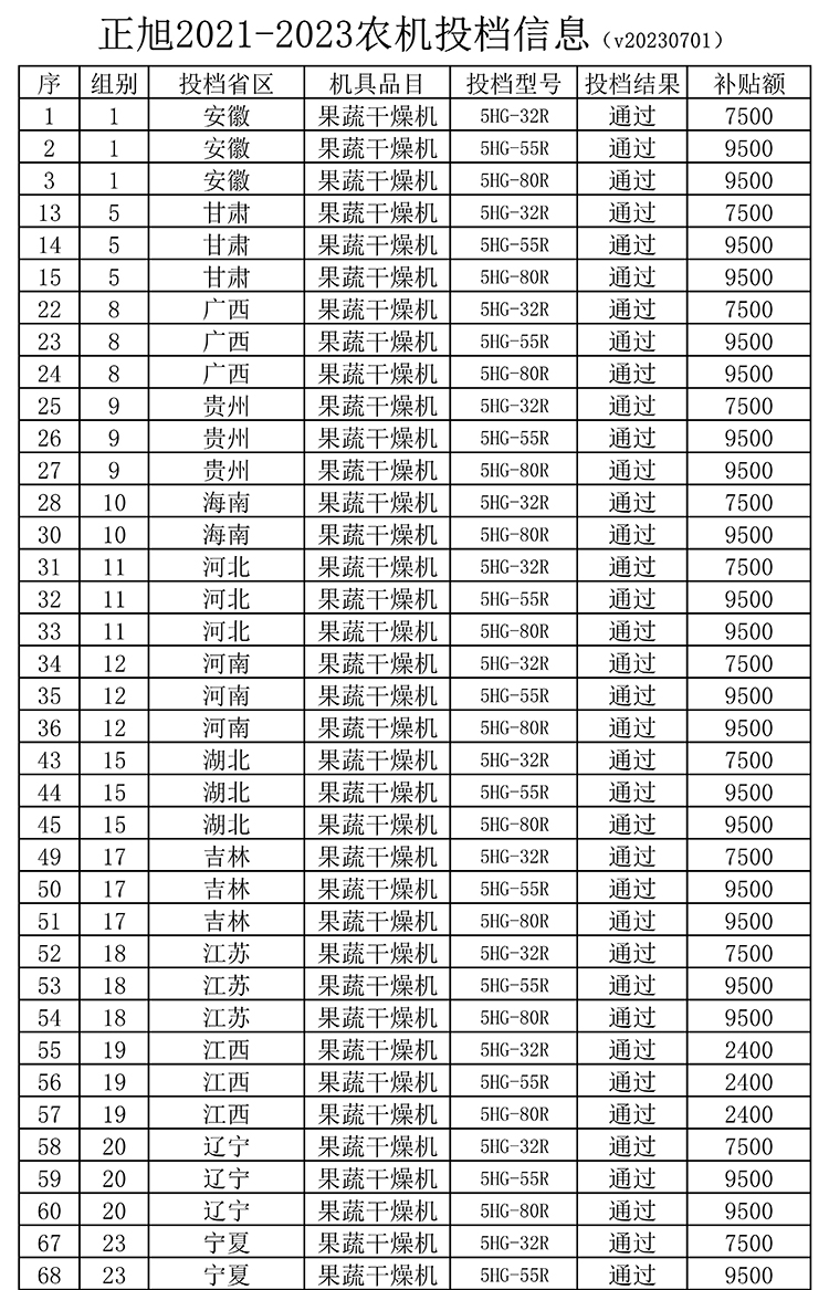 值得一提的是,正旭5HG-32R、5HG-55R、5HG-80R、5HGKB-90A四款果蔬烘干機成功進入安徽、甘肅、廣西、貴州、海南、河北、河南、湖北、吉林、江蘇、江西、遼寧、寧夏、青海、山東、山西、陜西、四川、新疆(含新建建設兵團)、云南、浙江、重慶22個省市自治區農機補貼目錄,使用正旭熱泵烘干機最高可享受9500元農機補貼款,這已是正旭連續多年進入各地農機補貼目錄。