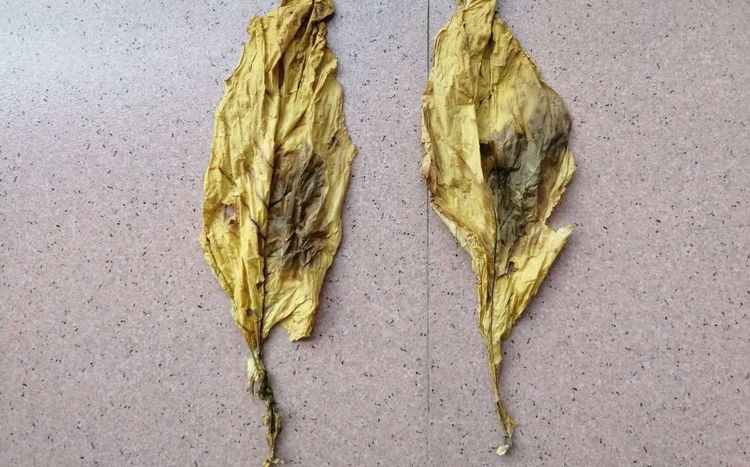 現(xiàn)象:烤制出的煙葉部分呈黑褐色,油分差,單葉重較輕,品質(zhì)低劣,幾乎無(wú)使用價(jià)值。