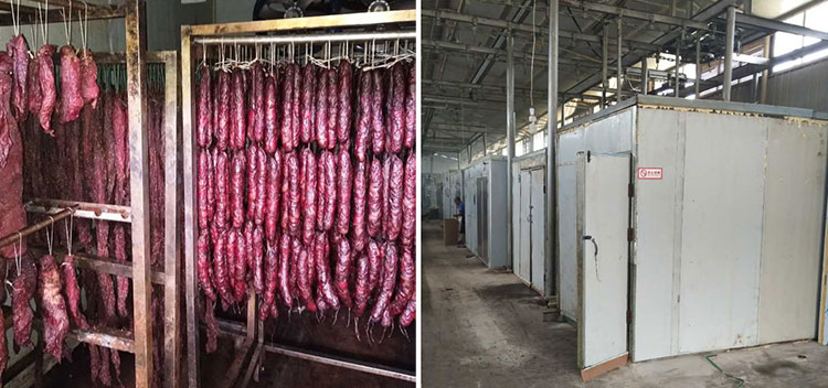 以正旭在四川某食品公司的臘腸烘干項目為例,其之前一直采用燃煤熱風(fēng)爐的方式進行臘腸烘制,不僅耗人工,還因無法精準(zhǔn)控制溫濕度導(dǎo)致不同批次臘腸風(fēng)味不一,無法保障品質(zhì)的一致性。后經(jīng)多方考察了解與正旭進行合作,我們?yōu)槠谂渲昧?臺15P熱泵烘干機組,改造后的烘干系統(tǒng)不僅節(jié)省了人力成本,智能化的控制技術(shù)還使烘制后的臘腸口味更統(tǒng)一,產(chǎn)品質(zhì)量實現(xiàn)標(biāo)準(zhǔn)化。最終烘制出的臘腸堅韌而有彈性,色澤鮮艷,吃起來味道醇香,風(fēng)味獨特,得到了客戶的極大好評!